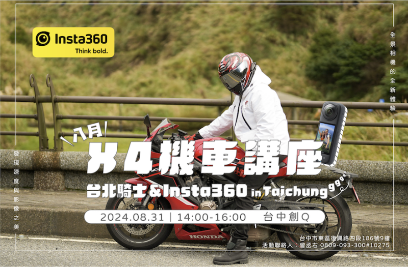 針對台中創Q Space,我們的好朋友 台北騎士 Taipei Rider 受邀前來,他將會分享使用X4進行機車攝影的心得感想,來就有好康可以拿,我們等你來!