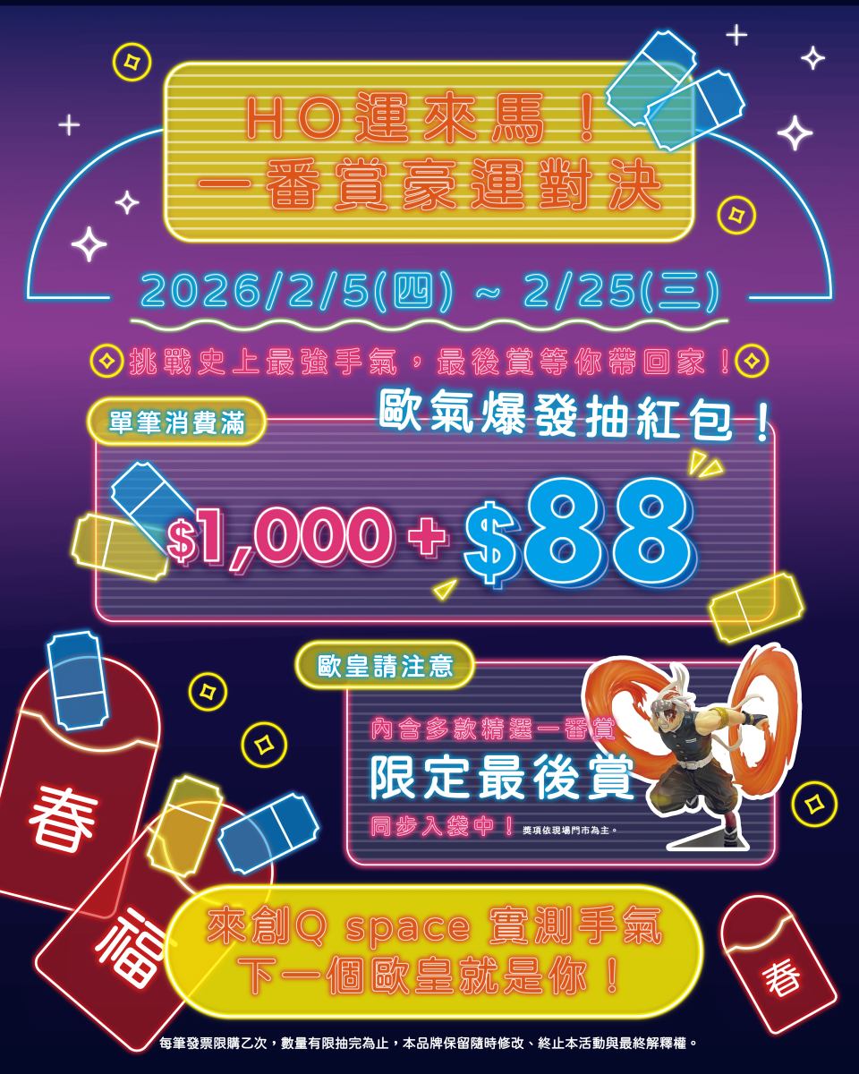 - 【參戰資格】 單筆消費滿 $1,000 + $88,即可發動技能:『歐氣爆發抽紅包』!